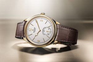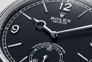 The Perpetual 1908 debuts in four references in yellow and white gold, with the option of white or black satin finish dials; the black dials look especially good. The designs are atypical for perfect copy  Rolex watches, featuring a sub-seconds dial at 6 o’clock, and a new handset. “Superlative Chronometer” drapes over the sub-seconds dial, calling to mind the Rolex Veriflat of the 1950s.